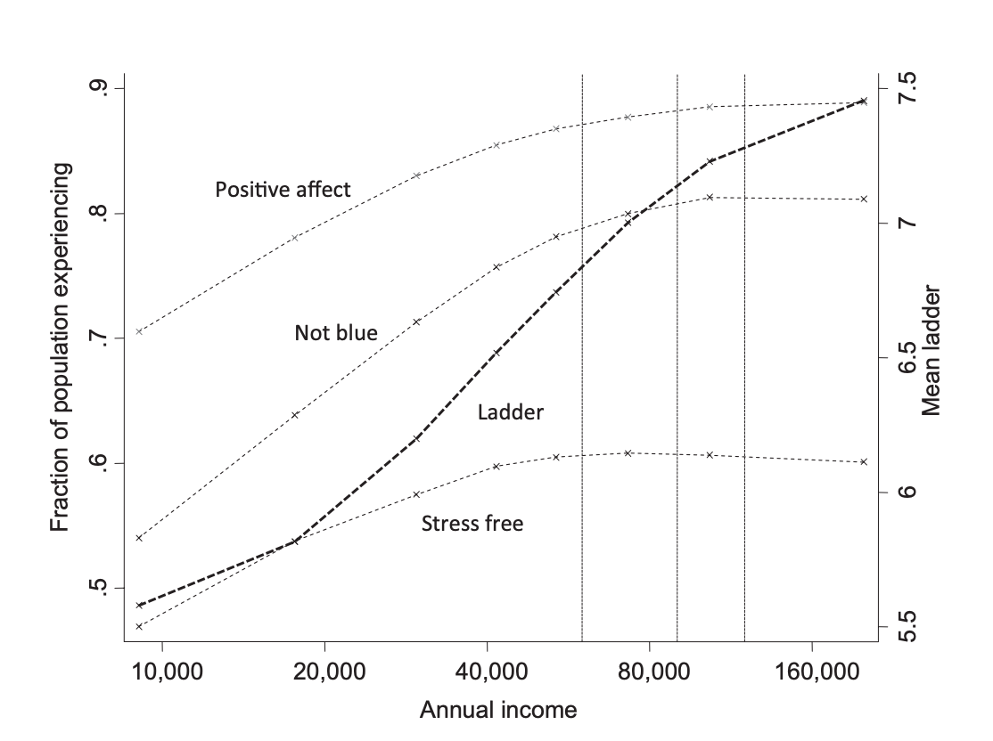 En 2010, Daniel Kahneman y Angus Deaton, ambos ganadores del premio Nobel en Economía, publicaron un artículo académico sumamente influyente titulado “Altos ingresos mejoran la evaluación de la vida pero no el bienestar emocional” (High income improves evaluation of life but not emotional well-being), donde analizaron más de 450.000 respuestas de encuestas realizadas a residentes de Estados Unidos. En este artículo argumentan que, a mayores ingresos, la evaluación que las personas hacen de sus vidas siempre mejora, pero el bienestar emocional se mantiene estable una vez superados los 75.000 USD anuales (75.000 USD en el 2010 equivalen a aproximadamente 113.000 USD hoy por la inflación).