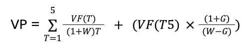 Para poder penalizar a los flujos futuros por este efecto del costo de oportunidad, tenemos que descontar cada flujo por una tasa de descuento, que resulta ser el WACC. Cuando la tasa de crecimiento a perpetuidad es menor al WACC, el valor presente se puede calcular de forma explícita cómo: