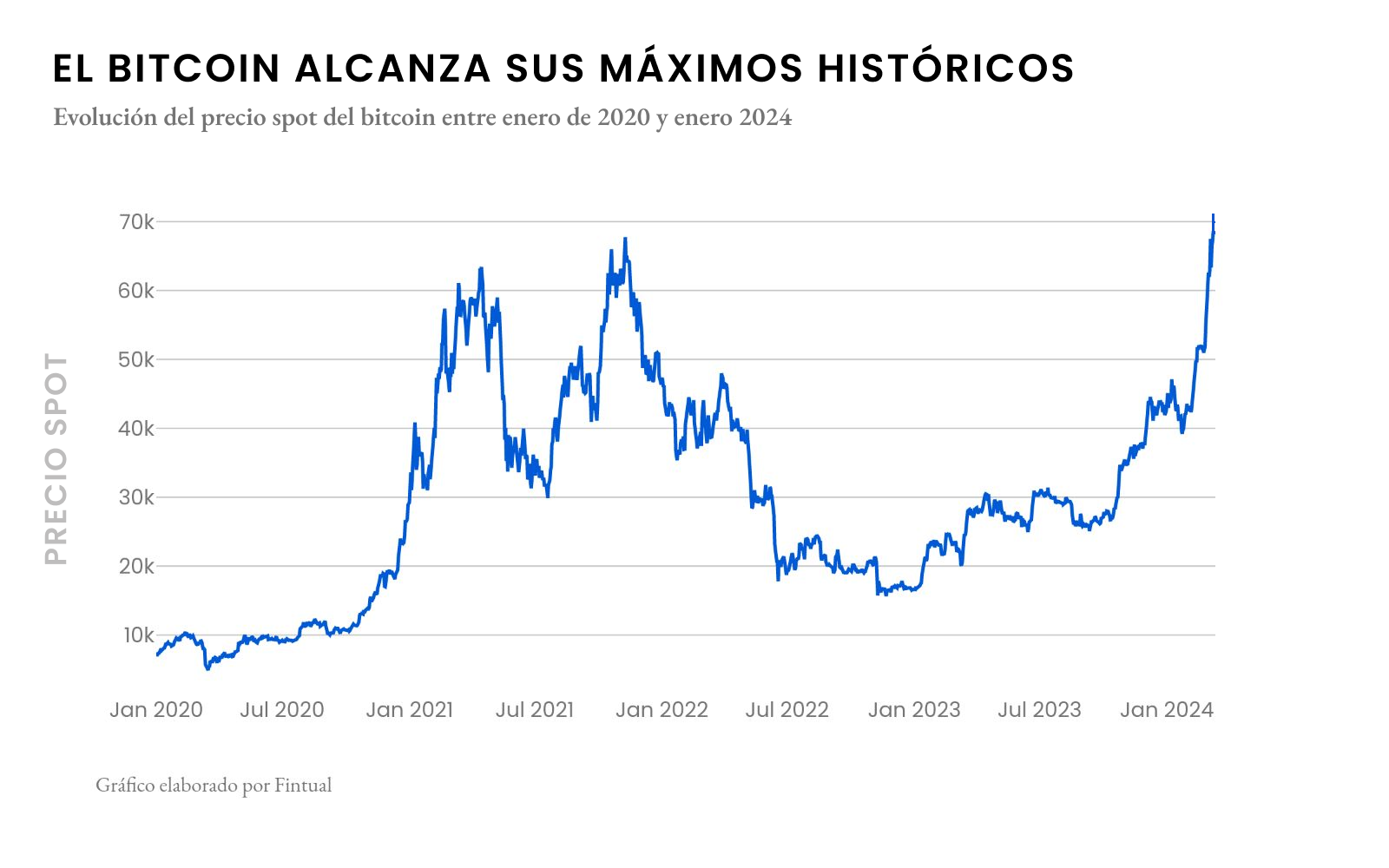 El Bitcoin –la criptomoneda de mayor circulación– marca la tendencia: superó su máximo precio histórico de 67.000 USD, llegando a 72.500. Un alza de más del 58% en lo que va del año y más de 21% tan solo la última semana.