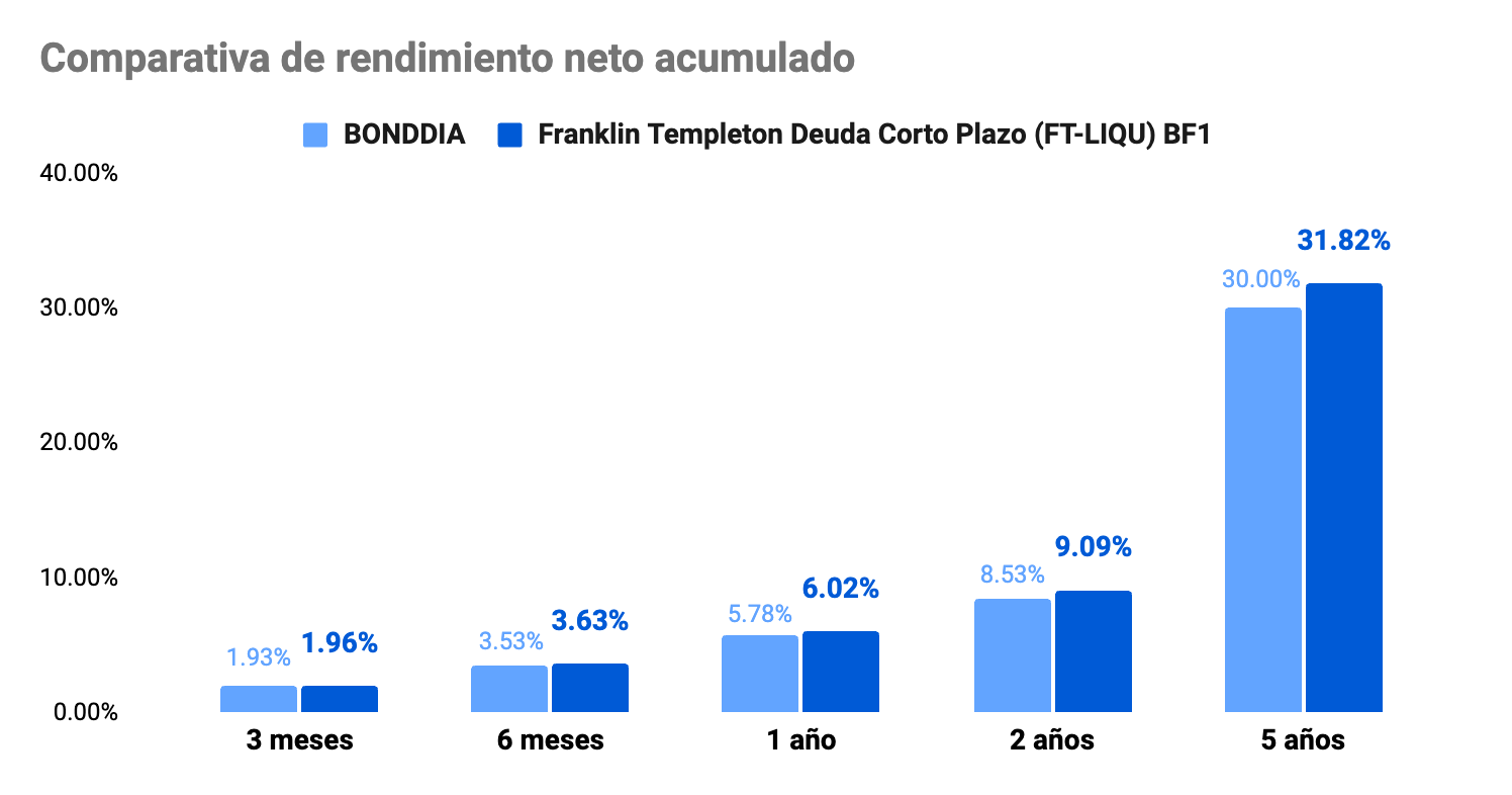 Y sí, los rendimientos netos de la serie BF1 de FT-LIQU son mejores que BONDDIA*: