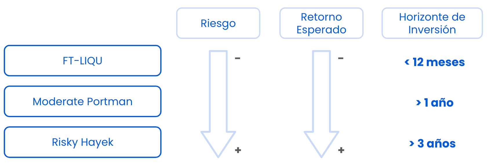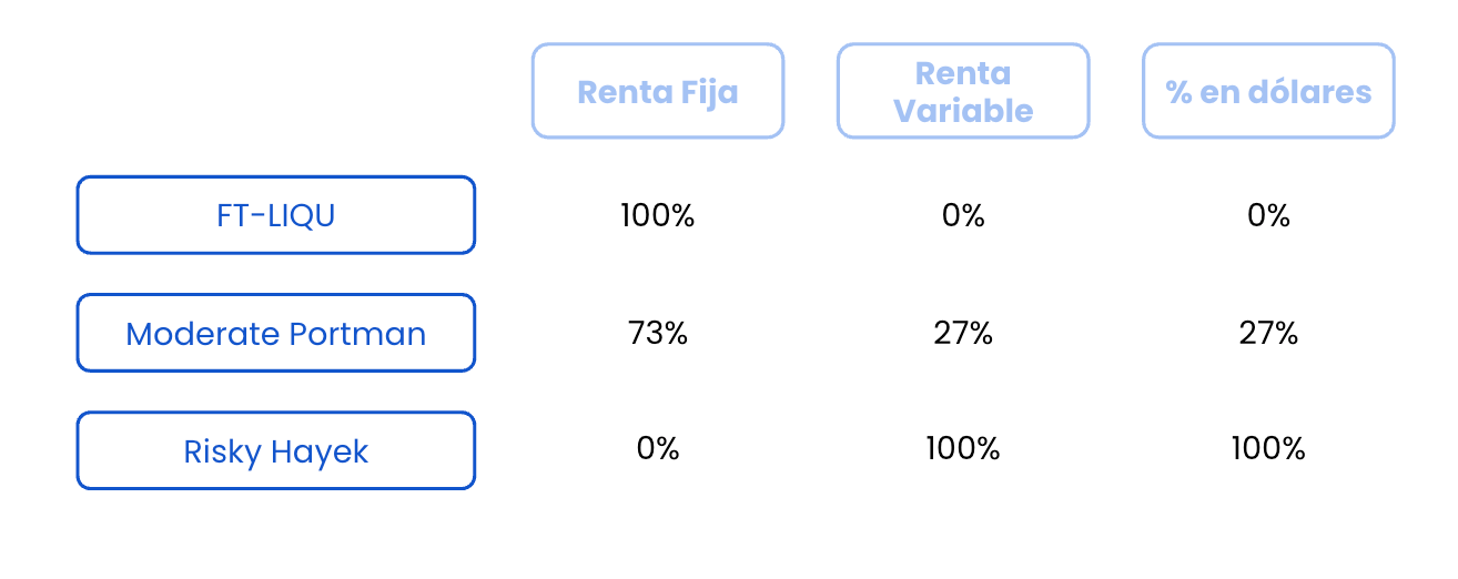 En Fintual contamos con tres fondos de inversión para México: Franklin Templeton Deuda Corto Plazo (FT-LIQU), Moderate Portman y Risky Hayek. Se diferencian en el nivel de riesgo y el horizonte de inversión. Acá te explicamos cómo funcionan y en qué se diferencian.