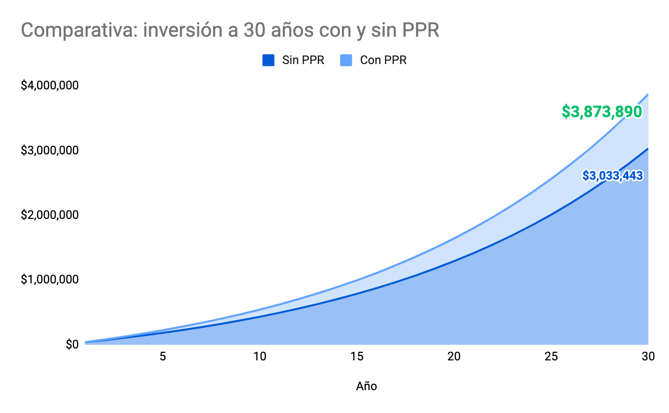 Siguiendo el ejemplo anterior, los 3.03 millones de pesos de una inversión normal aún quedarían sujetos a pagar el 10% de impuestos. Quedarían alrededor de 2.7 millones: más de 1 millón menos que en el PPR.