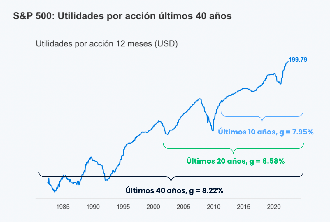 En el siguiente gráfico ponemos la evolución de las utilidades por acción que han tenido las compañías del S&P 500 a lo largo de la historia, aún considerando las fuertes crisis del pasado.