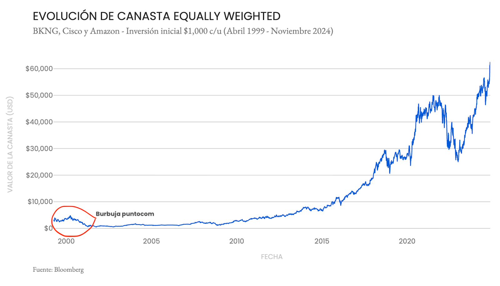 Para mostrarlo con datos: armé una gráfica usando una herramienta de IA interna de Fintual. Le pedí simular una inversión inicial de 3.000 dólares, mil en cada una de tres acciones que vivieron el boom y la caída puntocom, BKNG (Booking Holdings Inc., anteriormente llamado Priceline.com), Cisco y Amazon, compradas el 1 de abril de 1999 y mantenidas hasta noviembre de 2025. Esta canasta llegó a caer casi -90% desde su peak, pasando de 4.911 dólares en marzo de 2000 a solo 523 dólares en septiembre de 2001, pero aún así terminó entregando un retorno histórico anualizado de 12,39% y un valor final cercano a los 60 mil dólares.