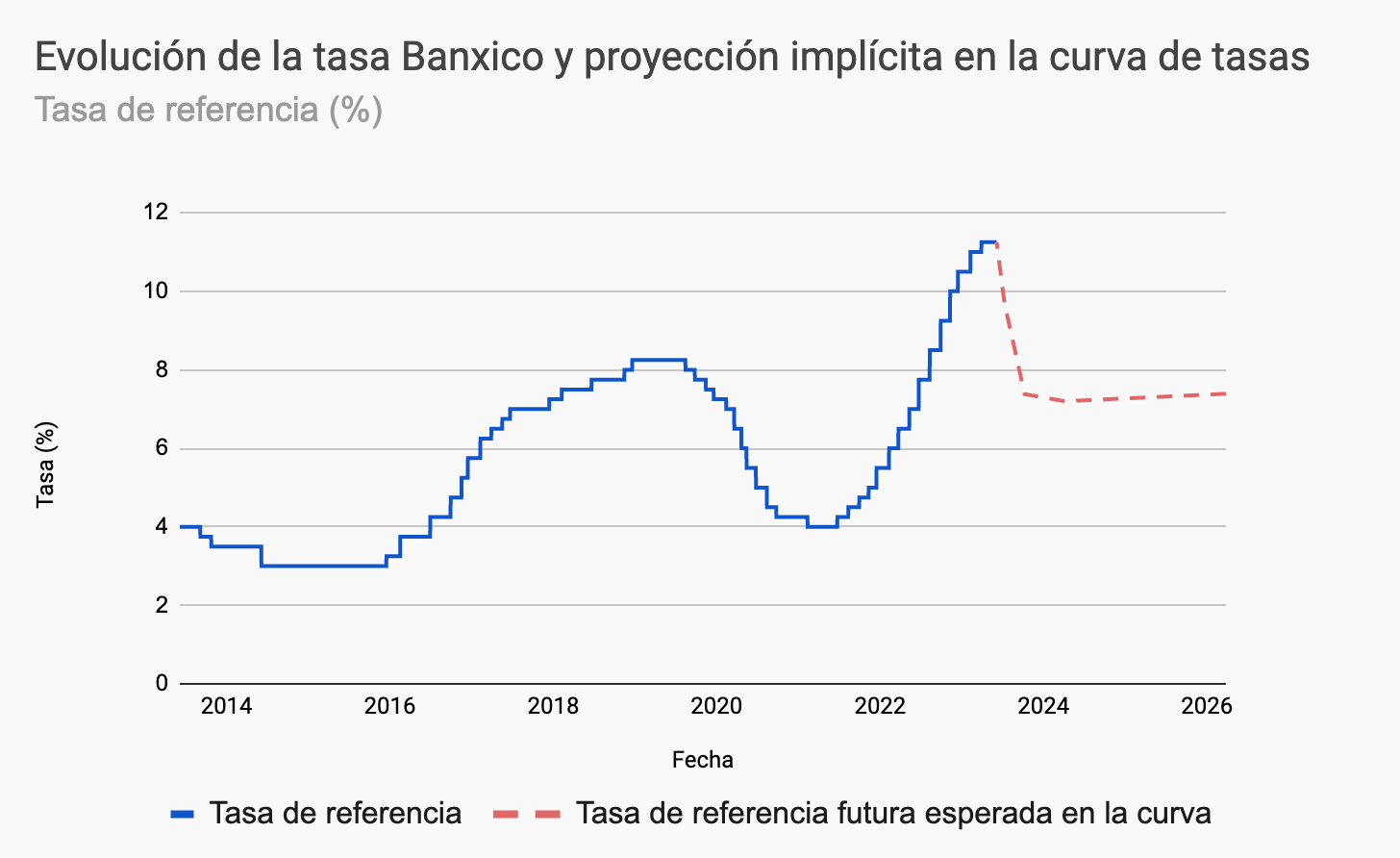De hecho, asumiendo que no hay distorsiones por excesiva volatilidad y otras incertidumbres, con un poco de matemática elemental se puede extraer, desde la estructura de tasas, la trayectoria de tasas de corto plazo esperada por el mercado. Por ejemplo, en la siguiente figura se muestra la evolución de tasa de referencia de Banxico y la proyección futura del mercado extraída desde la curva: