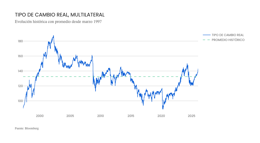 Desde una mirada fundamental —es decir, evaluando el tipo de cambio por sus determinantes económicos y no por niveles técnicos o "pisos psicológicos"— el peso está cerca de su equilibrio.