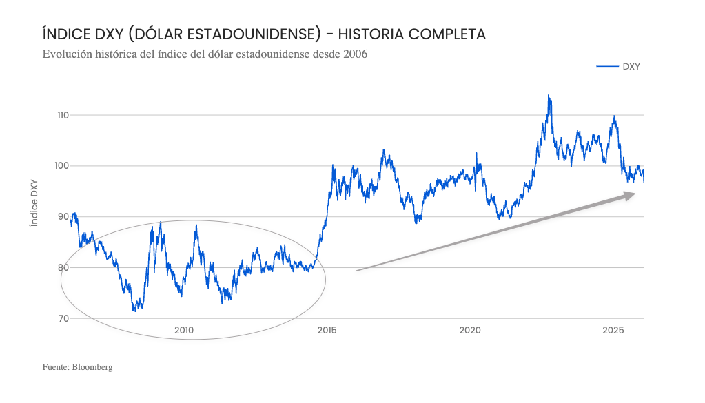 Para ver esa segunda parte hay una medida útil, pan de cada día en las mesas de inversiones, pero no muy famoso fuera de ellas: un índice llamado DXY. Este indicador mide la fortaleza del dólar contra una canasta de seis monedas relevantes: euro, yen, libra esterlina, dólar canadiense, corona sueca y franco suizo. En palabras simples, el DXY es un termómetro de qué tan fuerte está el dólar frente a otras monedas importantes.