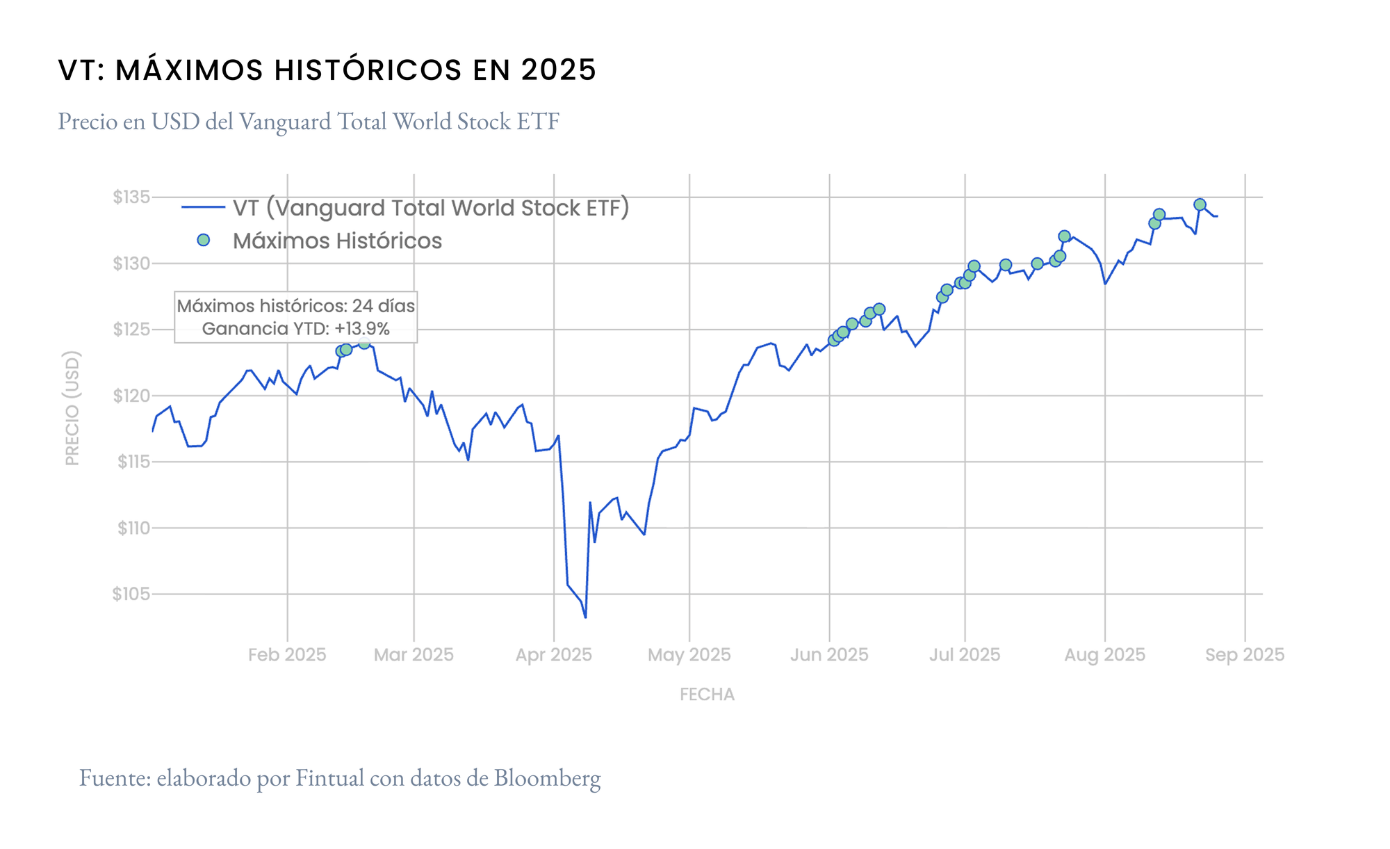 Esto le dio un impulso fuerte a los mercados (las bajas tasas de interés suelen ser buena noticia para las empresas porque sus costos de financiamiento se reducen).El discurso de Powell ayudó a sostener la racha positiva en las acciones. El viernes el VT, ETF de acciones globales, una vez más alcanzó un nuevo máximo.