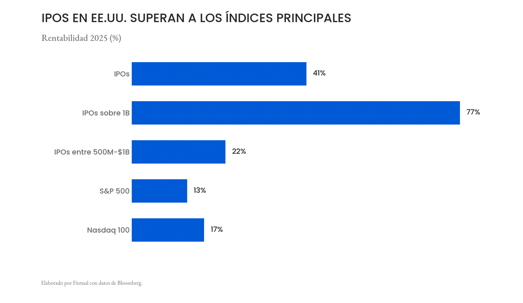 En el neto, el mercado ha recaudado 32 mil millones de dólares este año, su mejor desempeño desde 2021. Y aunque históricamente muchas IPOs terminan rindiendo menos que el mercado, los ETFs enfocados en ellas, como FPX e IPO, también superan al S&P 500 en 2025.