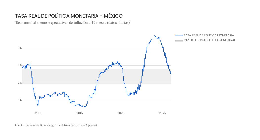 En cuanto al tipo de cambio, no anticipamos movimientos significativos hacia adelante. Por un lado, como señalamos en la sección anterior, el crecimiento económico de México este año será positivo, pero de magnitud acotada. Por otro, estimamos que gran parte de la apreciación del peso observada el año pasado responde principalmente a una corrección del castigo previo que había incorporado el tipo de cambio, asociado al ruido político y a la implementación de la Reforma Judicial.