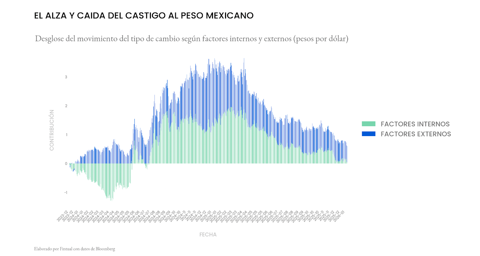 Este punto se aprecia con mayor claridad en el siguiente ejercicio, donde, a través de un modelo lineal, se descompone la evolución de la paridad USDMXN en función de factores externos y domésticos.