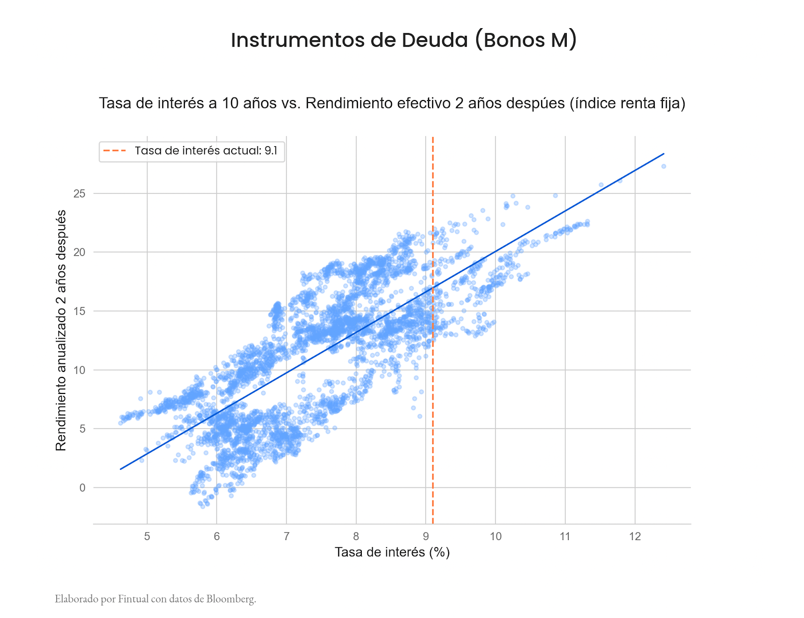 En primer lugar, creemos que el nivel actual de las tasas de interés de largo plazo a lo largo de la curva de bonos del gobierno de México se ubica significativamente por sobre las tasas de equilibrio de la economía. Este elevado premio por plazo se traduce en retornos esperados atractivos hacia adelante. Incluso bajo un escenario inflacionario más persistente, las posiciones en bonos de largo plazo denominados en UDIs continúan ofreciendo tasas reales interesantes. En el siguiente ejercicio analizamos la evolución histórica de la tasa del bono del gobierno de México a 10 años y evaluamos su rendimiento efectivo dos años después. Como se observa en la figura, a partir de niveles de tasa similares a los actuales, los rendimientos acumulados en los dos años siguientes nunca han sido inferiores al 13%.
