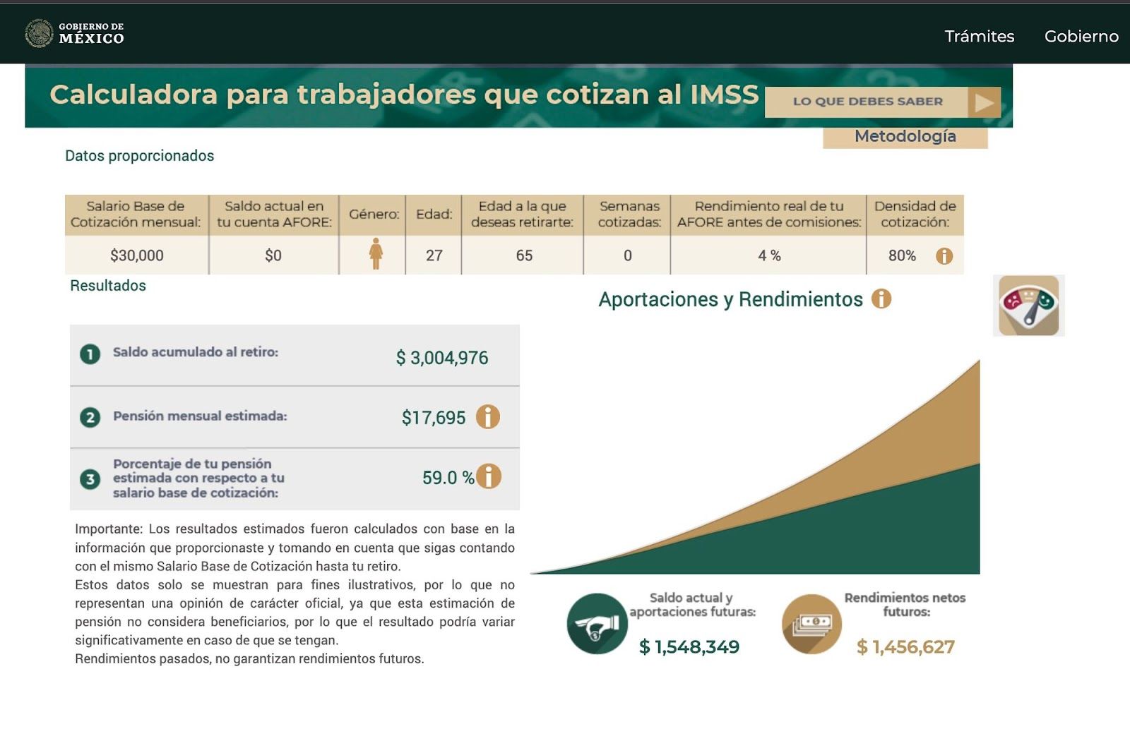 Haciendo algunas simulaciones con la calculadora del Consar (Comisión Nacional del Sistema de Ahorro para el Retiro), usando simplemente la Afore más grande, y asumiendo un 4% de rendimiento real, y suponiendo que Paula va a tener en su vida un salario base promedio de $30,000 (es decir, uno sueldo neto de unos $25,000 aproximadamente, que es la definición de un ingreso de clase media en zonas urbanas según el Inegi), el resultado es que su pensión estimada a los 65 años será de $17,695 mensual, es decir, una tasa de reemplazo de 59%, algo bajo ese ideal 70% que mencionamos anteriormente. Este número asume una densidad de cotización del 80%, es decir, que un 20% del tiempo Paula no cotizó en el sistema formal.
