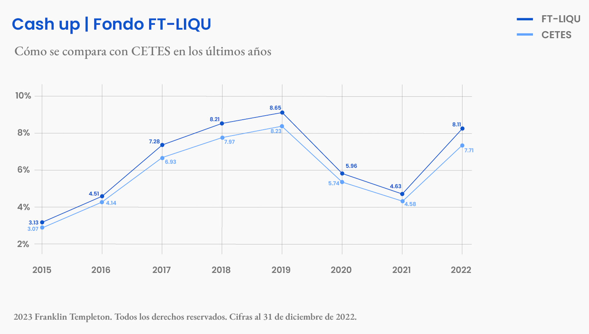 El fondo FT-LIQU tiene rendimientos muy similares a CETES, la diferencia es que el rendimiento parece menor porque, en el caso del FT-LIQU, el impuesto a la retención (0.08% para 2022 y 0.15% para el 2023, que explicamos acá) se aplica proporcional día a día, mientras que en un CETES directo este impuesto se cobra al final, es decir, al vencimiento del plazo (y te lo quitan antes de que te regresen tu dinero, por supuesto).
