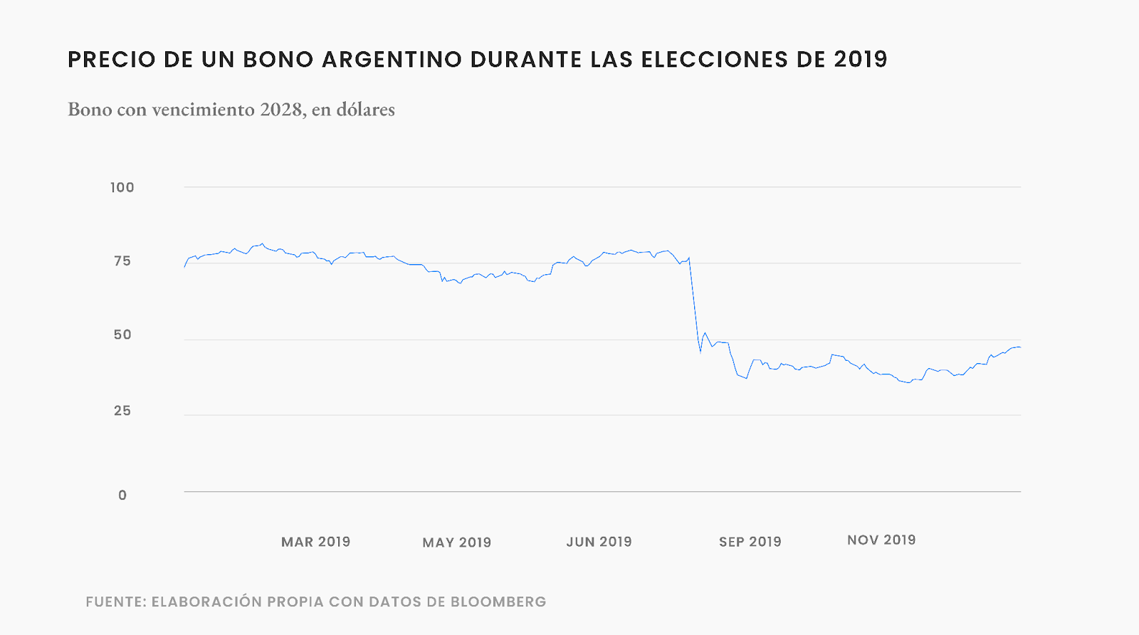 Por ejemplo, veamos cómo se movió el precio de los bonos de Argentina en las elecciones de 2019.