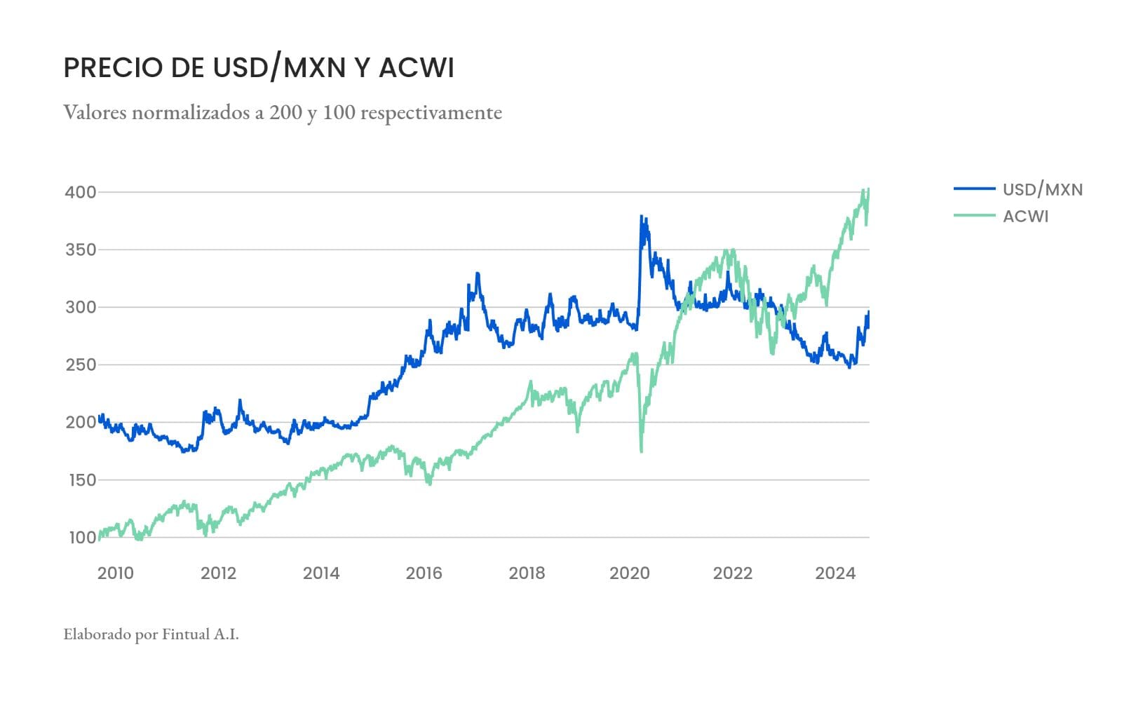 En el caso de un inversionista mexicano, este punto (ver retornos en pesos versus retornos en dólares) marca una gran diferencia, porque el peso mexicano tiene una correlación negativa con las bolsas mundiales (es decir, cuando las bolsas caen, el peso se deprecia y el dólar sube). Esto hace que desde nuestra perspectiva, las bolsas extranjeras se vean menos riesgosas en el largo plazo que para un estadounidense.