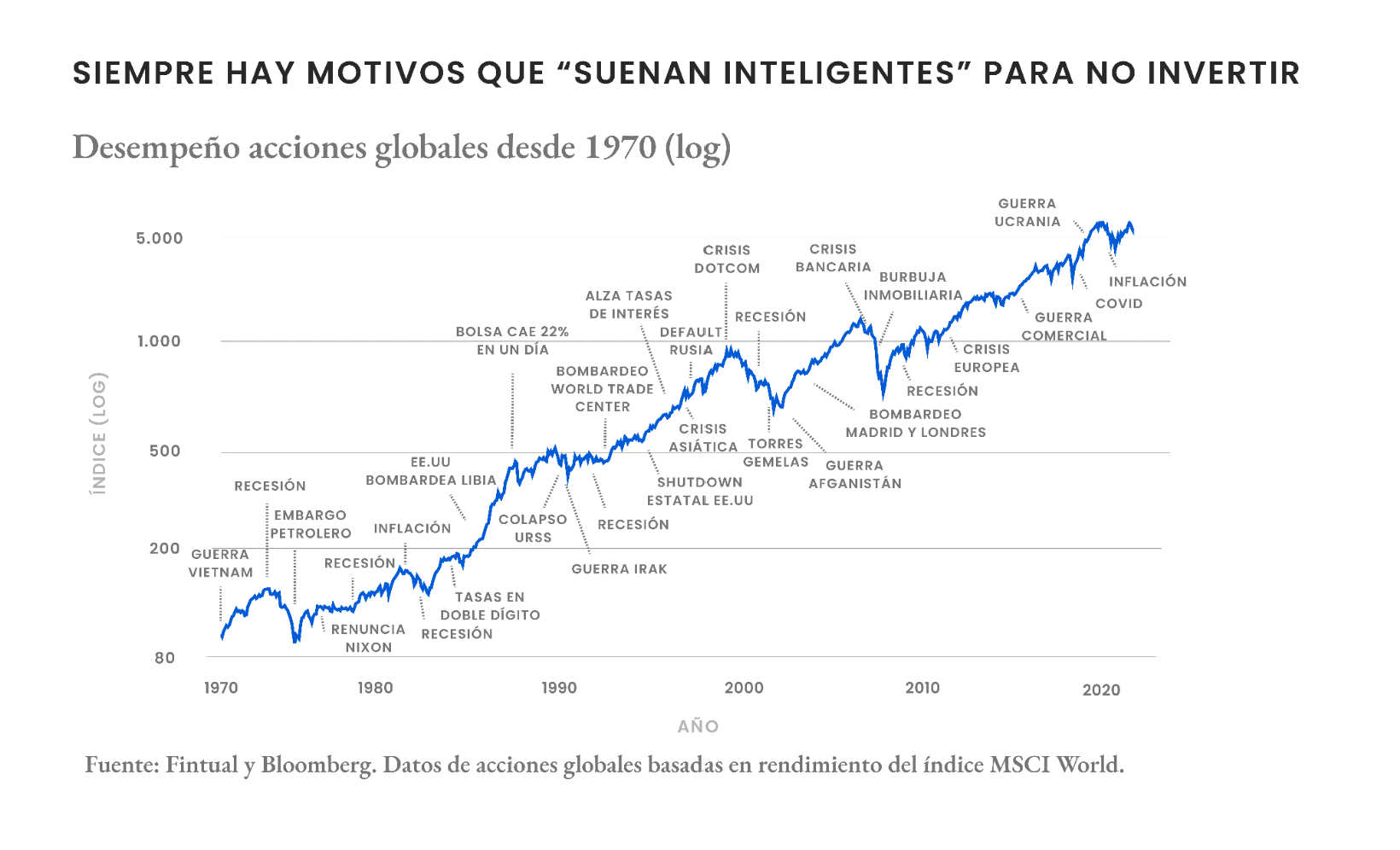 Mantener la calma. Este tipo de correcciones han pasado muchas veces, y existe harta evidencia de que mantener la calma es la mejor estrategia en estas situaciones. Siempre hay razones para no invertir, pero ni las noticias más negativas han logrado impedir la tendencia alcista de los mercados.