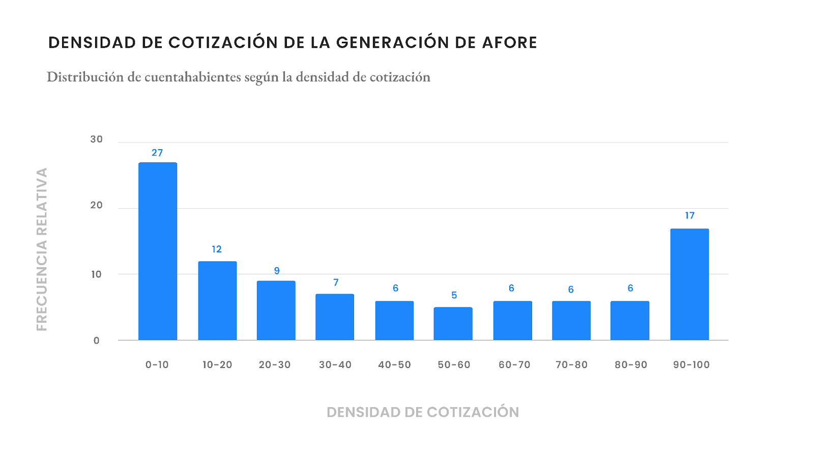 Así, la pensión que reciben los trabajadores depende de lo que acumulen en su AFORE, que se determina por su salario, los rendimientos que tuvieron sus ahorros, y la densidad de cotización (la proporción de periodos con aportación que el trabajador realiza al sistema de pensiones respecto del total de tiempo que ha permanecido en el mercado laboral).