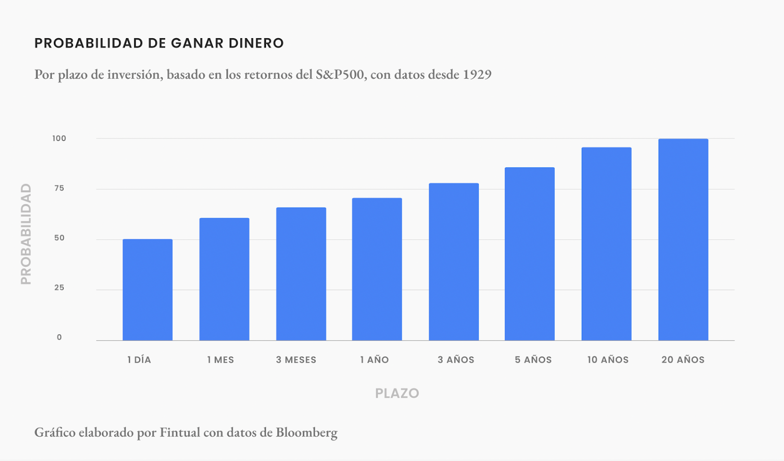 Lo que intento decirte aquí es que mientras más tiempo inviertas, tus probabilidades mejoran y puedes asumir algo más de riesgo, como ya vimos, buscando rendimientos más atractivos.