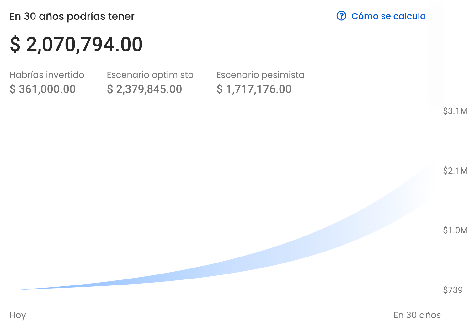 Como puedes notar, te presentamos tres resultados diferentes: uno optimista, uno “normal” y otro pesimista. Estos escenarios contienen el 95% de los casos estimados posibles en tu inversión.