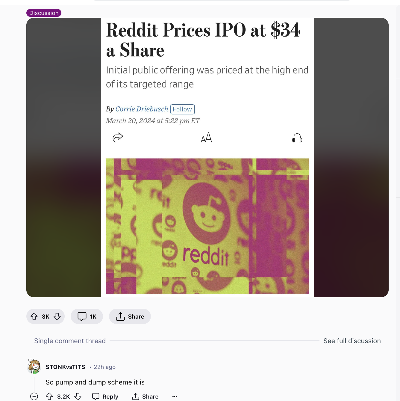 La influencia que tuvo Reddit en los movimientos de las acciones de GameStop le dio la confianza a varios usuarios para afirmar que quieren apostar contra la acción de Reddit (a que baje) porque no les gustó la idea de que la empresa se haga pública: argumentan que la página va a dejar de estar enfocada en sus usuarios y que perderá su gracia. Y a nivel más cuantitativo, creen que el precio con el que salió la acción estaba inflado para crear una estrategia pump and dump: inflar los precios al principio para que los dueños de las acciones pueden vender caro rápido y ganar algo extra antes de que caiga al precio normal.