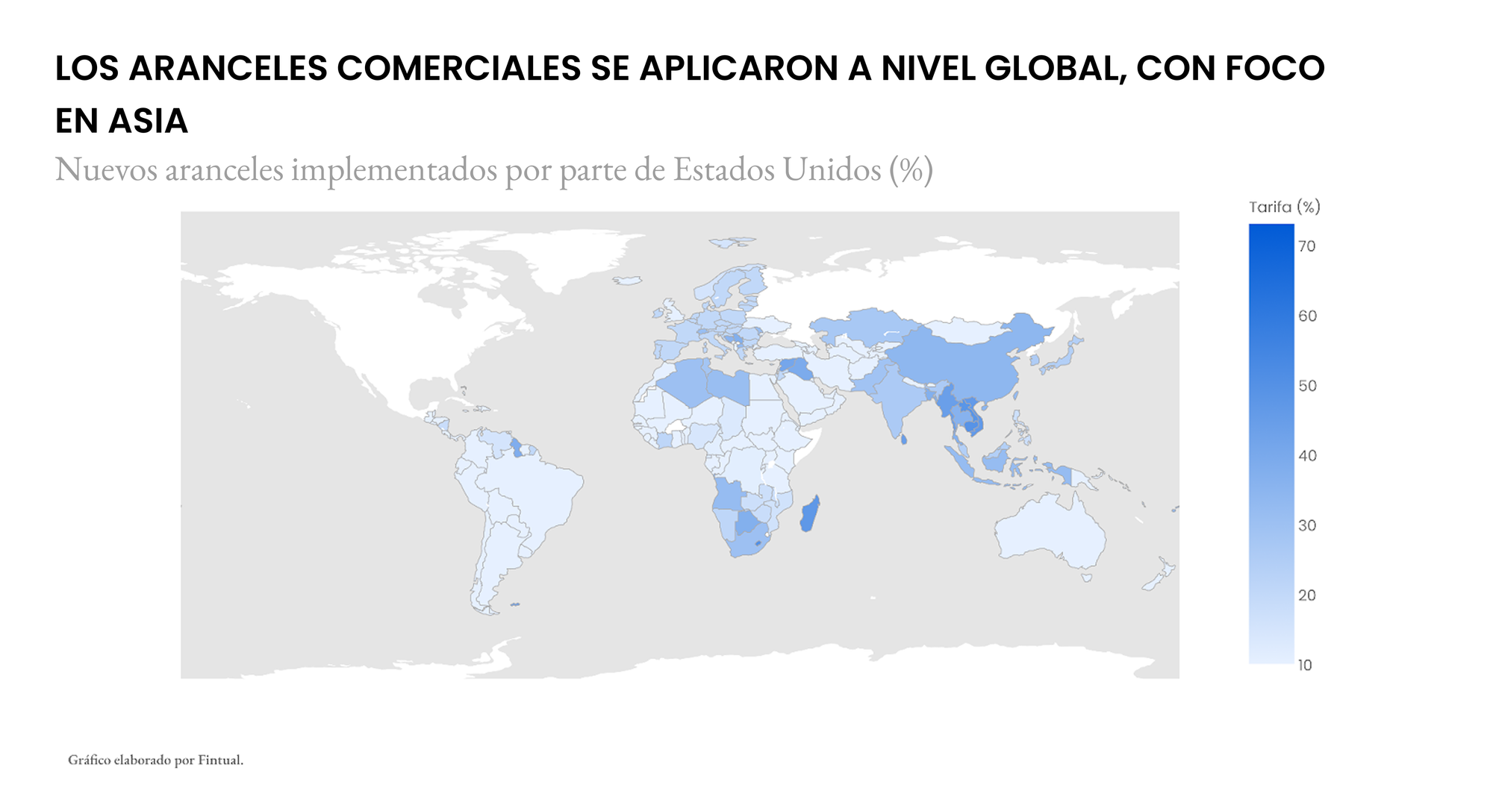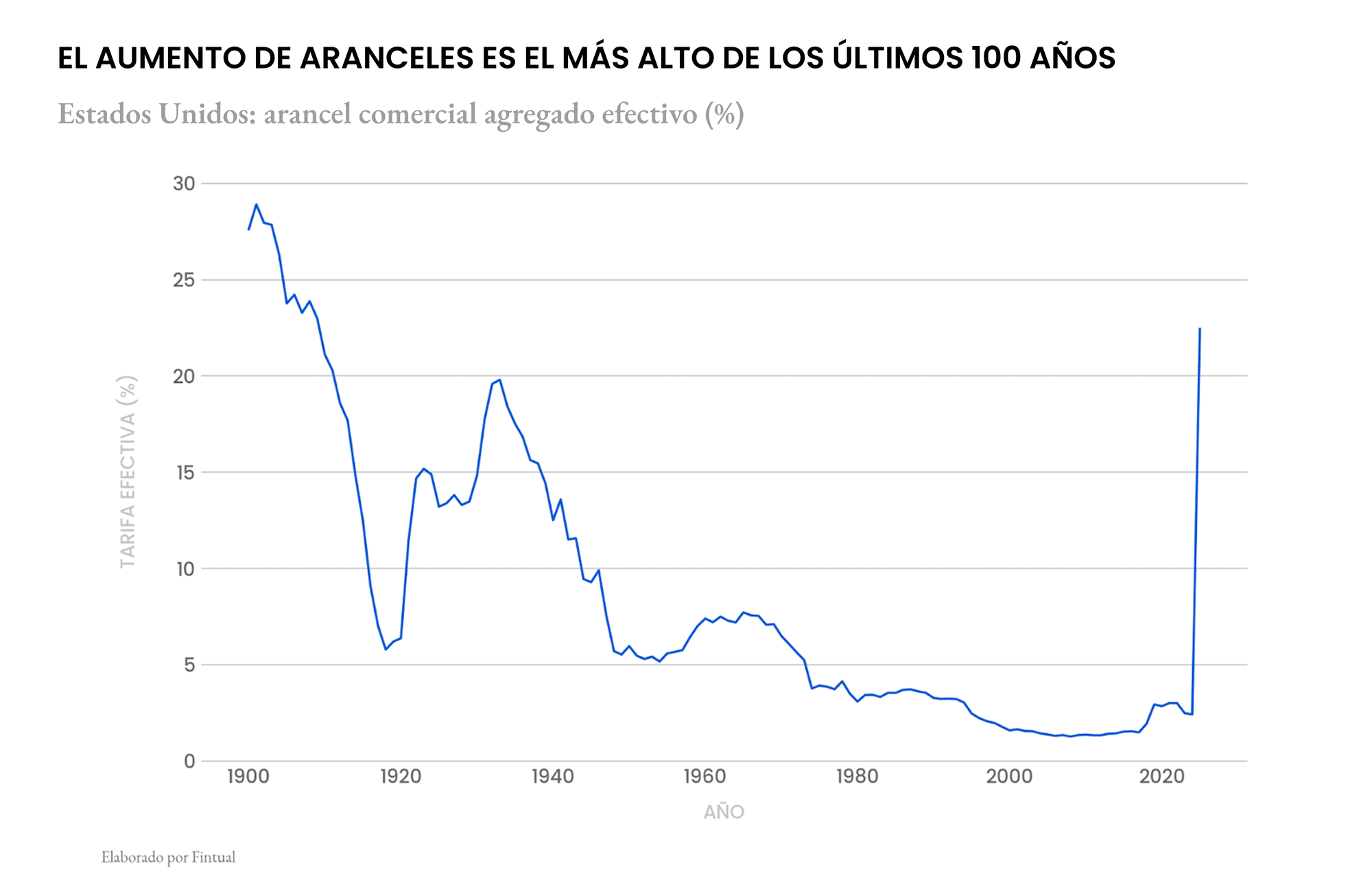 Estos aranceles van del 10% al 50%, elevando el promedio arancelario estadounidense de cerca del 0% a más del 20%, niveles no vistos desde comienzos del siglo XX.