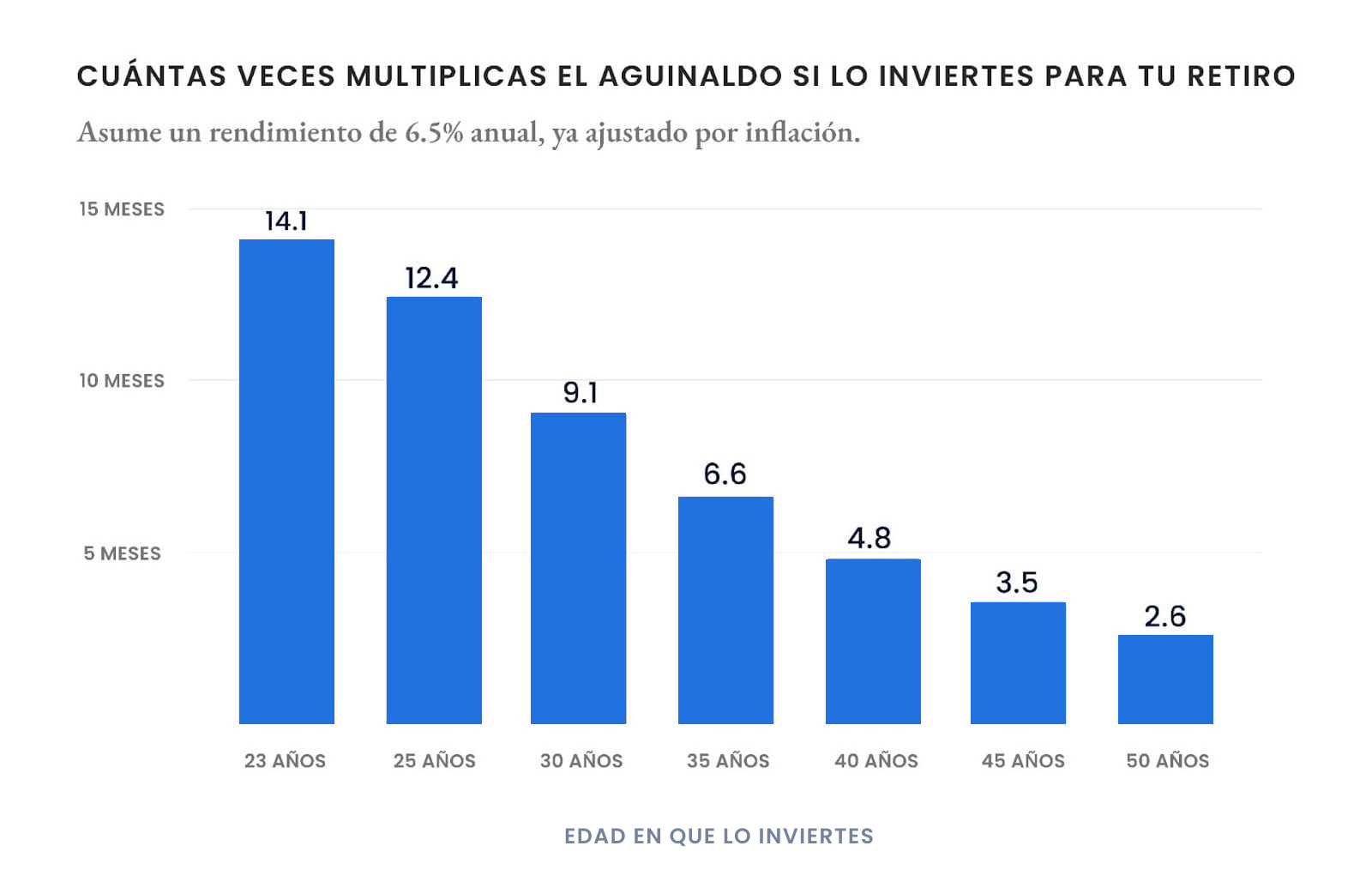 Especialmente si lo haces siendo muy joven, como lo era yo a mis 23 años cuando recibí mi primer aguinaldo (que no invertí porque nadie me mostró esto). Y es que ese monto podría incluso multiplicarse por 14 meses cuando cumplas 65 años y lo necesites para jubilarte.