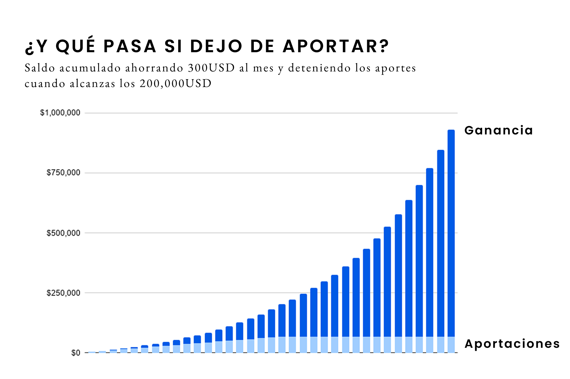 En ese caso, el monto juntado es de aproximadamente $930,000 USD, que no es muy lejano del $1,073,000 USD en el caso donde sigues haciendo aportaciones durante 16 años más.