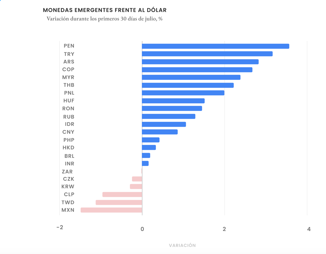 Con tantas preguntas abiertas, el peso es la moneda que más ha perdido terreno frente al dólar en el último mes, dentro de las principales monedas emergentes.