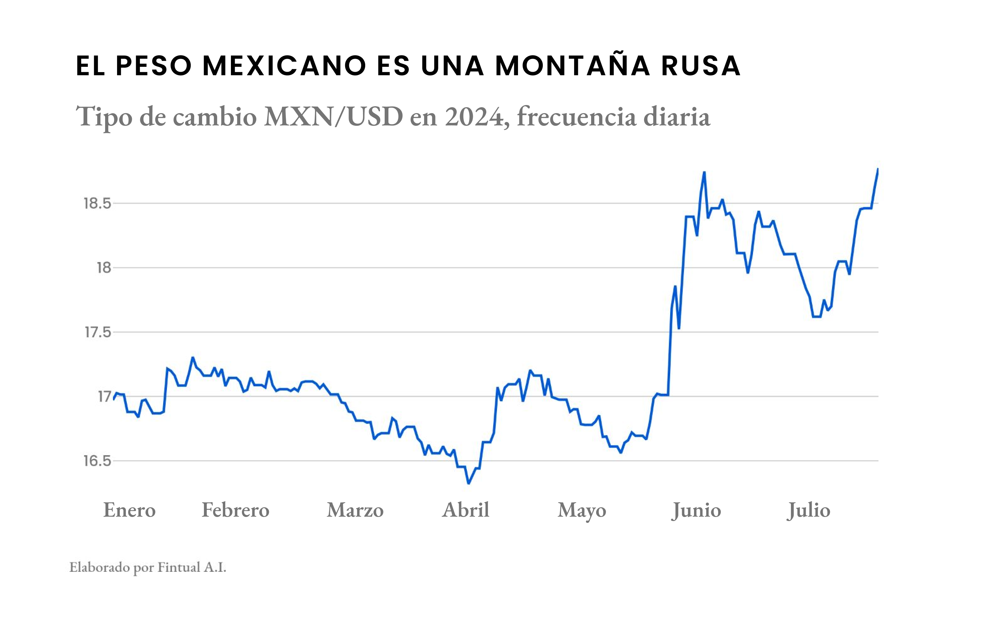 El peso mexicano parece una verdadera montaña rusa este año. Después de tocar un mínimo de 16.3 pesos por dólar en abril, el tipo de cambio subió fuerte al acercarse las elecciones del 2 de junio, y con la sorpresa de mayoría calificada alcanzó los $18.70 pesos por dólar el 12 de junio. Y aunque el peso vio cierta recuperación temporal durante julio, ya está de nuevo acercándose a los 19 pesos por dólar.