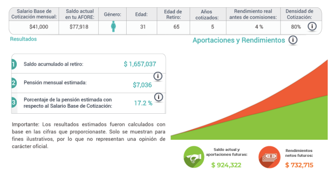Después de llenar esos datos vas a poder ver más o menos cuánto vas a ganar cuando te retires. También puedes conocer la suma de tus aportaciones futuras (de acuerdo a tu sueldo actual) y los rendimientos que generará ese ahorro.