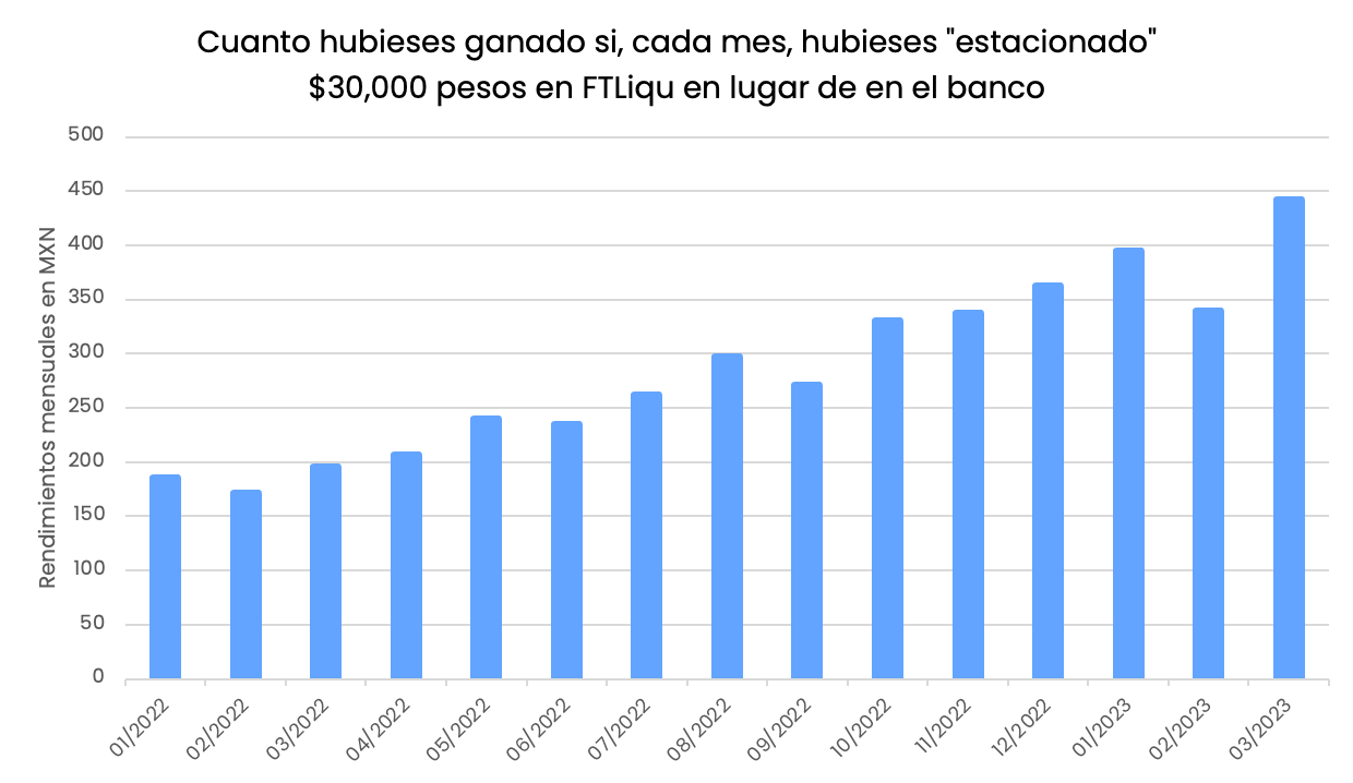 El rendimiento varía, pero hoy es poco menos de 1% por mes*. Entonces, si, por ejemplo, ganas $30,000 por mes, te podría generar cerca de $275 pesos al mes.