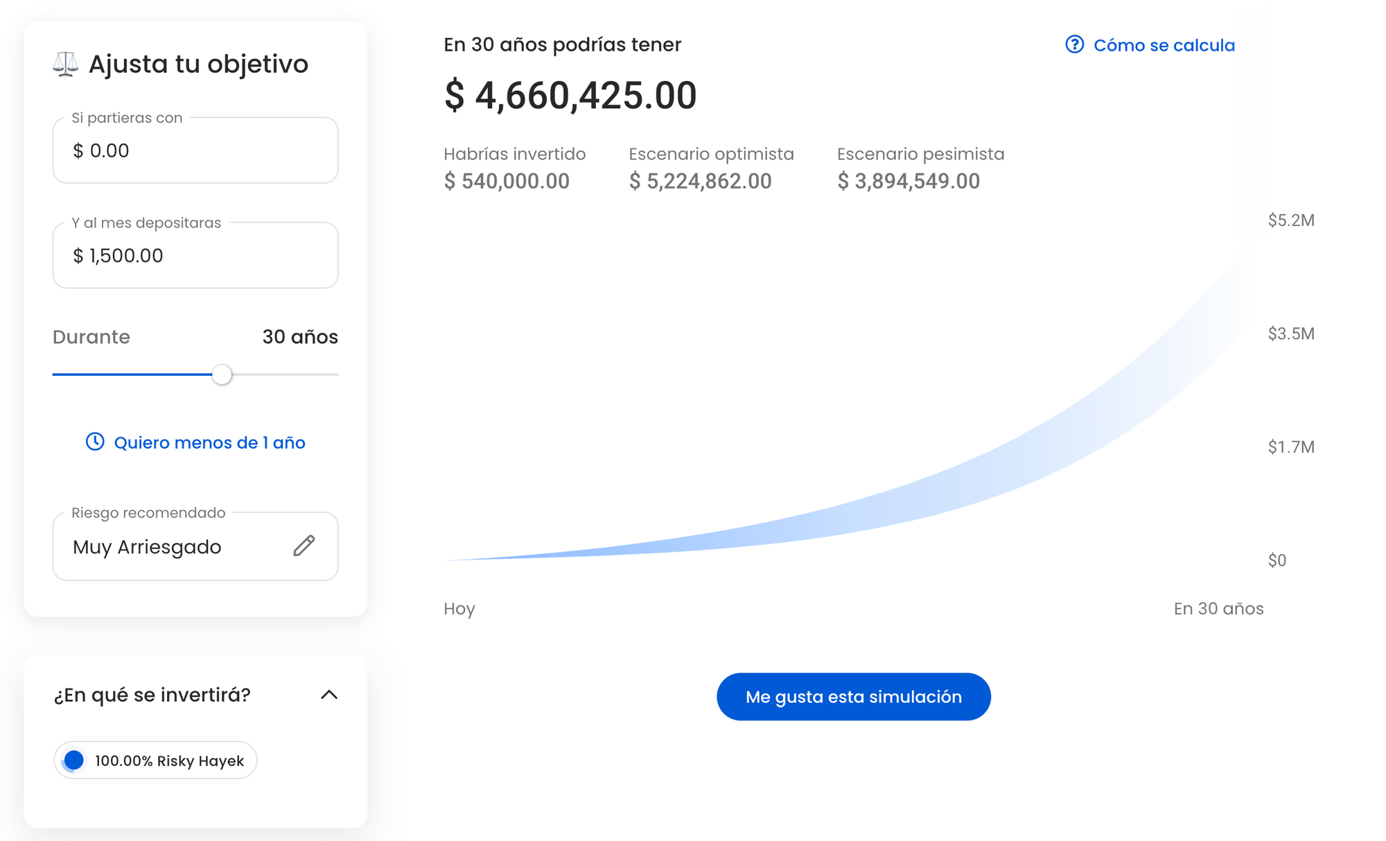 Entonces, parece que invertir no suena tan mal, ¿No? Tus aguinaldos podrían hasta comprarte una casa (o un depa si estás en CDMX porque #gentrificación) si les das el suficiente tiempo. Mira un ejemplo con uno de nuestros portafolios, el Risky Hayek: