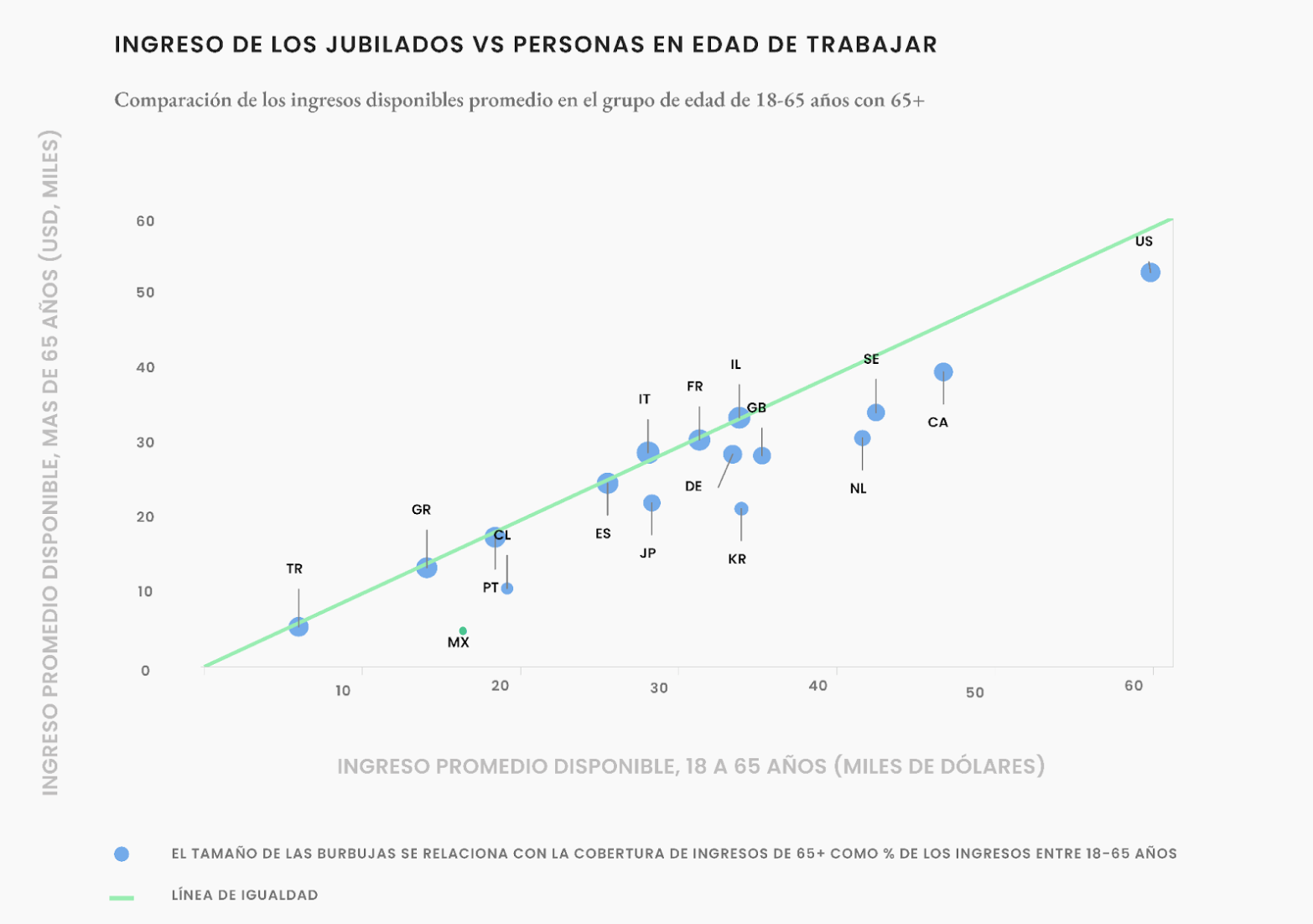 En países como Francia, Israel o España, la gente mayor tiene casi el mismo ingreso que la gente en edad de trabajar. De hecho, en Italia tienen incluso un poco más. Pero en México estamos bien lejos de esos países. En nuestro país la calidad de vida disminuye sustancialmente al jubilar.