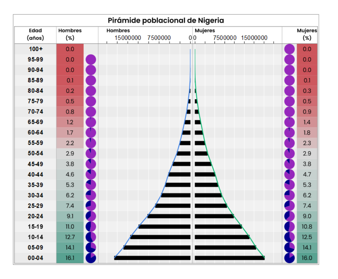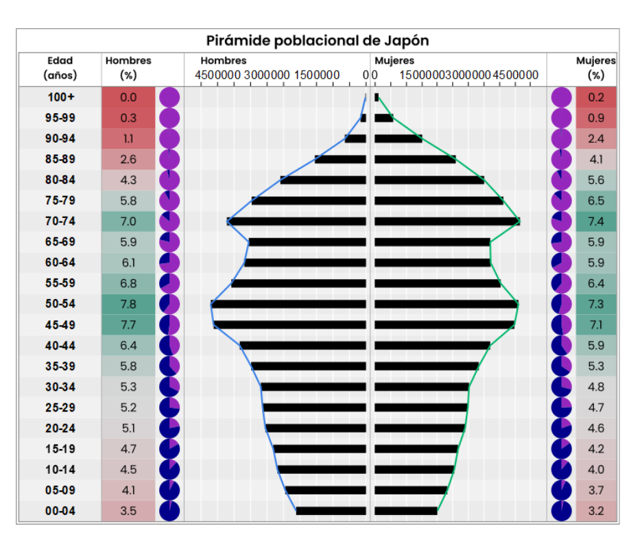 Pero ojo: a medida que la población sigue envejeciendo, el porcentaje de personas dependientes aumenta y el bono demográfico desaparece. Las pirámides de población toman formas como estas: