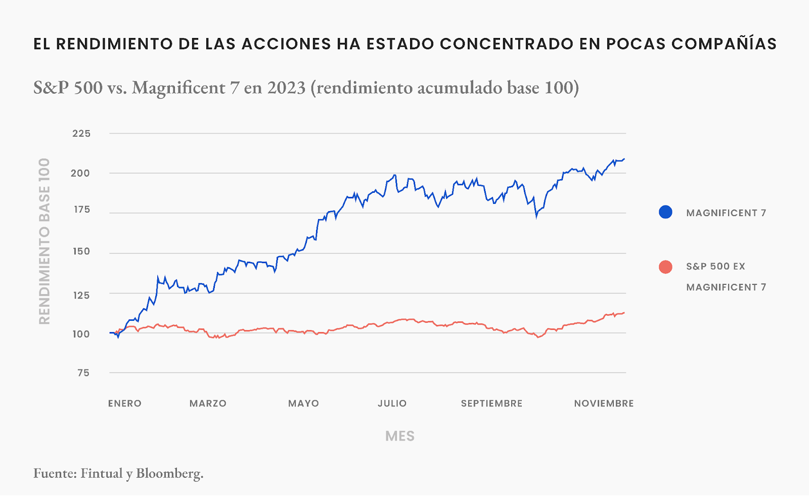 Mientras las Magnificent 7 acumularon un rendimiento de más de 100%, el S&P 500, excluyendo a estas compañías, obtuvo tan sólo un 12% de retorno (recuerda que el S&P 500 considera a las 500 compañías más importantes que transan en el mercado, por lo que el índice incluye a las 7 magníficas).