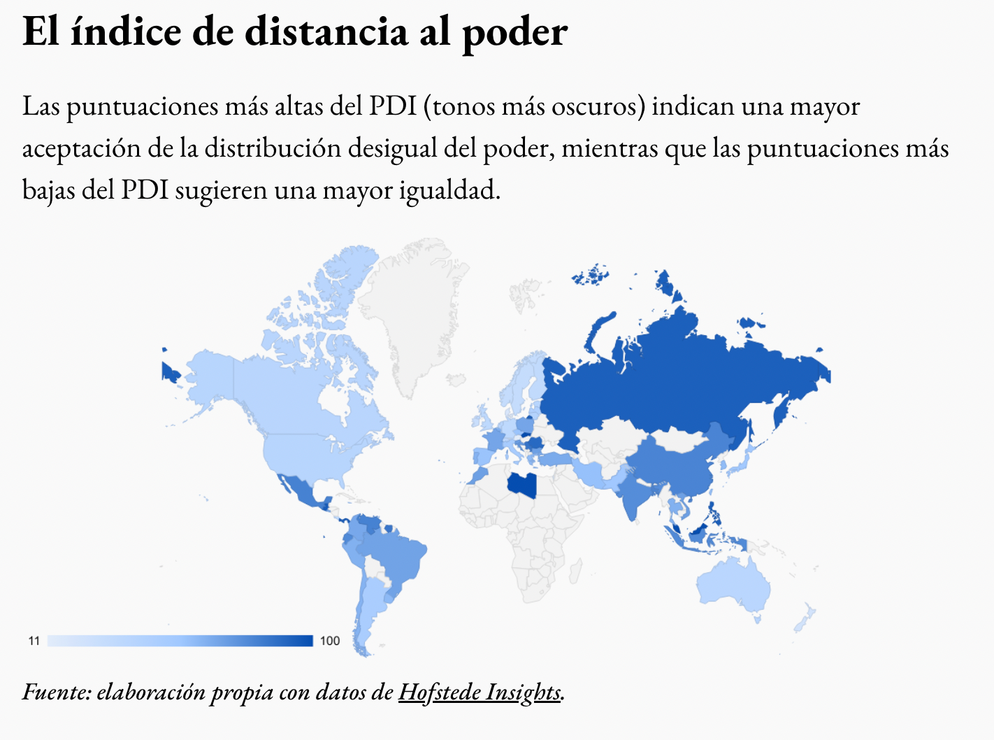 Las puntuaciones más altas del PDI (tonos más oscuros) indican una mayor aceptación de la distribución desigual del poder, mientras que las puntuaciones más bajas del PDI sugieren una mayor igualdad.