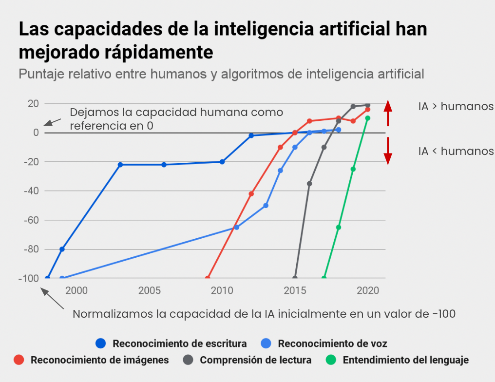 Como se ve en la figura, hace 10 años no habían algoritmos de inteligencia artificial que pudiesen superar de manera consistente las capacidades humanas. Sin embargo, en los últimos años esta tendencia cambió, y los modelos de IA superan con creces a los humanos en todas las categorías.