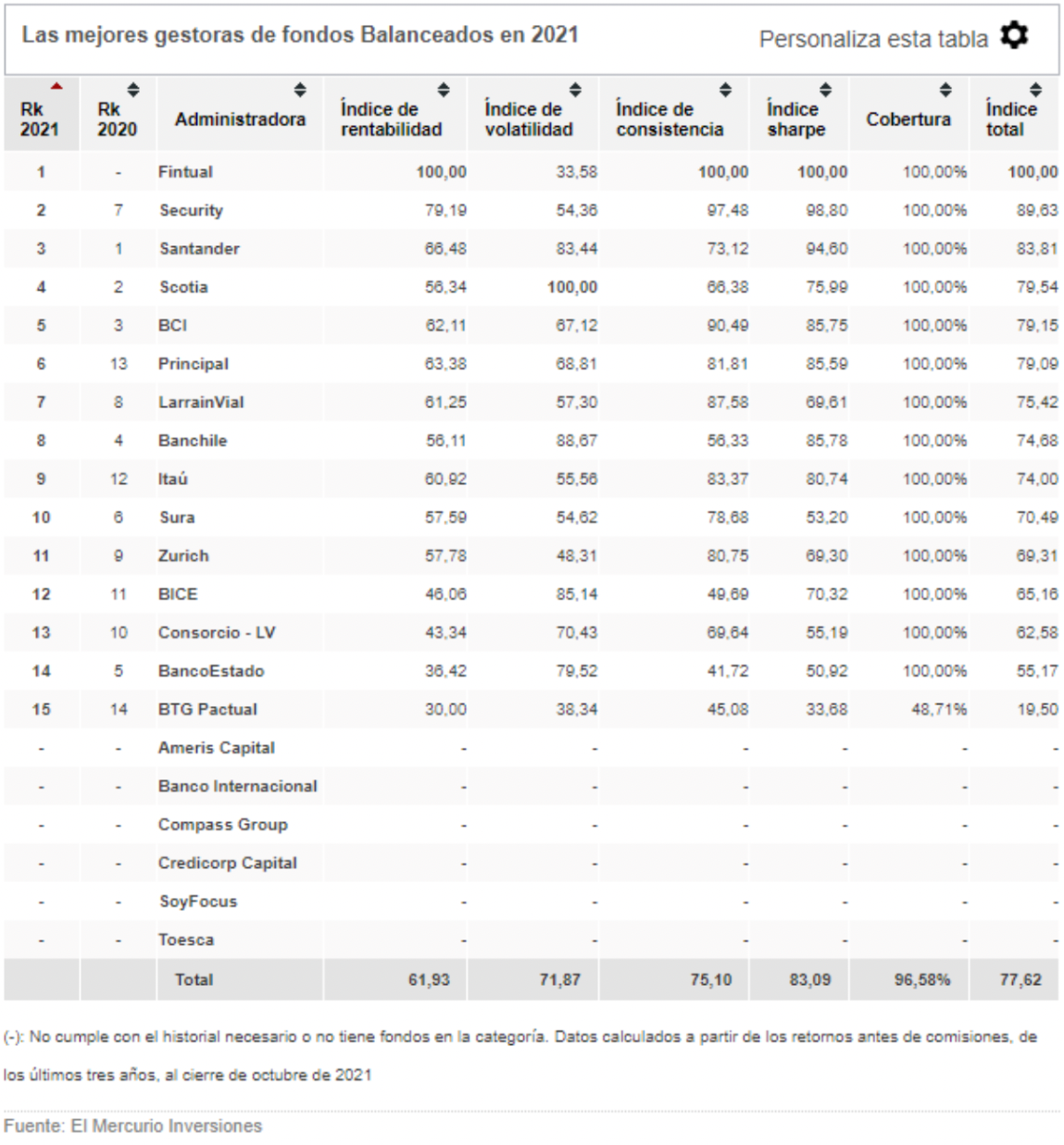 El Mercurio Inversiones publicó su ranking de las mejores administradoras para los fondos mutuos (fondos de inversión, como los conocemos en México) balanceados en 2021 y Fintual se llevó el primer lugar.