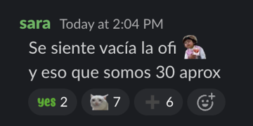 En Slack las personas usan fotos de perfil que no siempre son su cara, entonces pasó mucho que “Ah tú eres @ javi”, “ah, tú eres @ alexm”. Diría que el offsite aceleró las relaciones humanas al menos 6 meses. Y lo comprobé al encontrar grupos de personas que jamás pensé que se juntarían, o que tendrían temas de conversación.