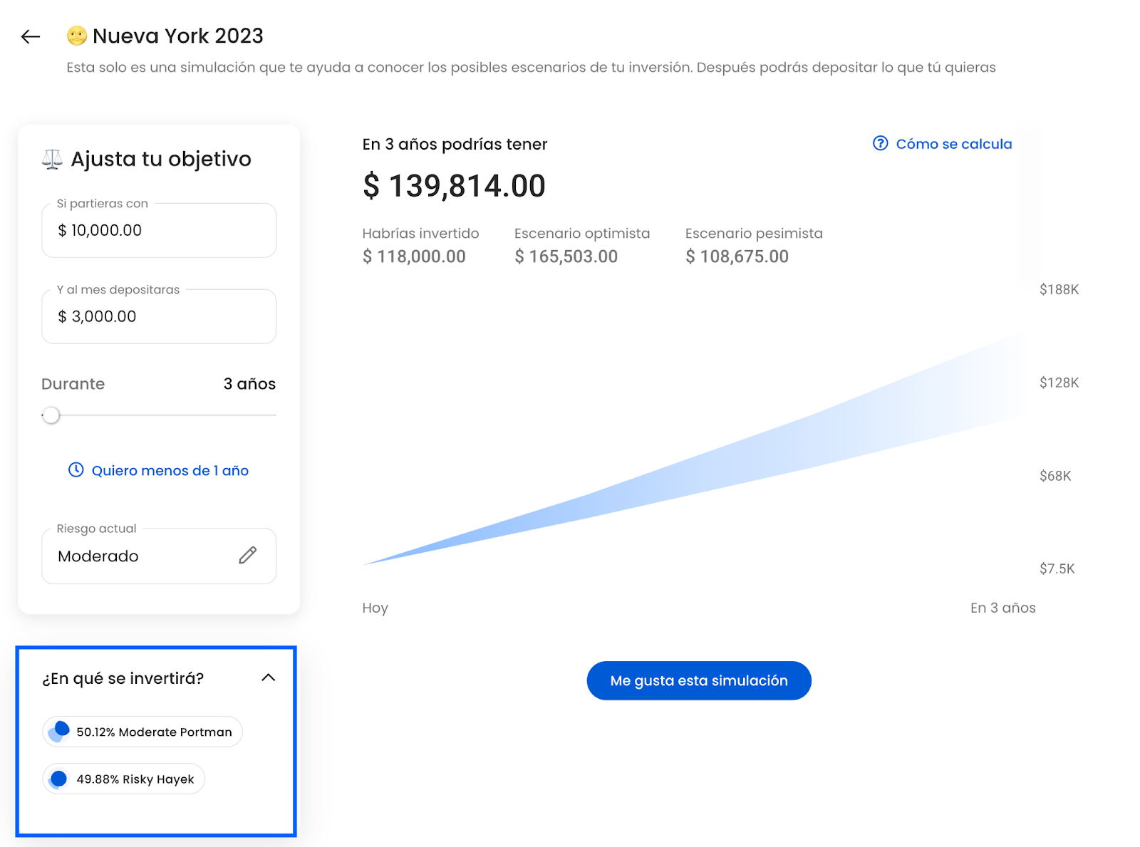Ahora, dependiendo el horizonte de tu inversión y tu perfil de riesgo, podrás crearte un nuevo objetivo que contenga un porcentaje invertido en Moderate Portman y otro porcentaje en Risky Hayek.