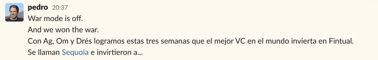 Así textual fue el mensaje que Pedro escribió en Slack el 30 de julio. “El mejor VC del mundo”. En la oficina sabíamos que en las últimas semanas los founders estaban en un rally de reuniones con muchos Venture Capital (VC) del mundo y había un poco de cansancio y ansiedad por saber cómo nos iba a ir.
