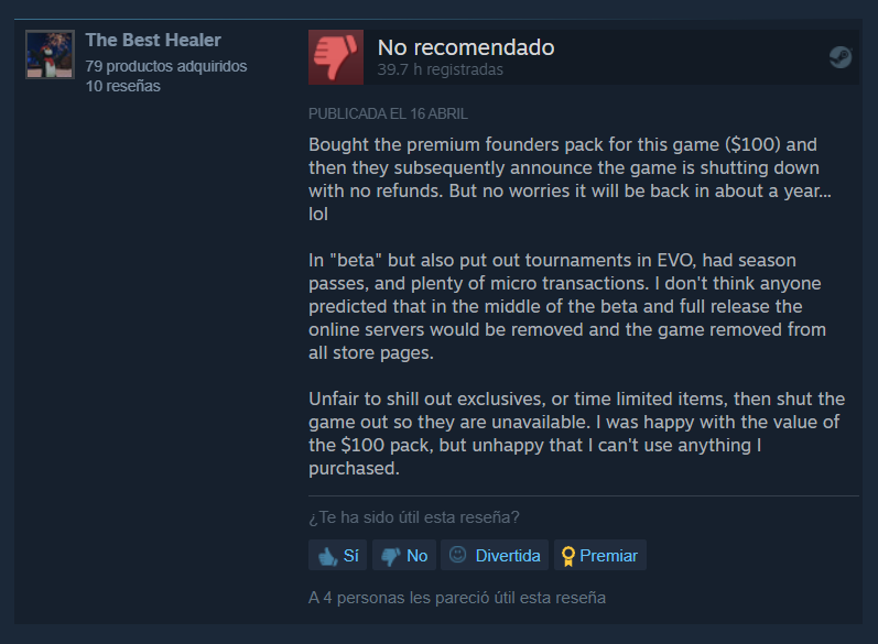 Si bien varios jugadores recibieron con entusiasmo la noticia, esperando que esto les dé más tiempo para mejorar el servicio, muchos expresaron su descontento. Los dardos provienen de quienes compraron el pase de batalla, pensando que el juego ha sido lanzado oficialmente (siendo justos, desde Player First Games nunca aclararon desde el comienzo cuándo terminaba el periodo de beta), y exigen un reembolso. Los desarrolladores respondieron que solamente se aplican las políticas de reembolso de cada empresa. Sin embargo, Steam solo ofrece reembolsos hasta 14 días después de haber realizado la compra, y lo mismo aplica para Sony y Microsoft. El juego ha sido removido de las tiendas digitales a la fecha de redacción de este artículo. Si uno lo intenta buscar en la versión web de Steam, no da resultados.